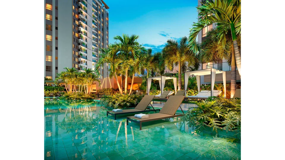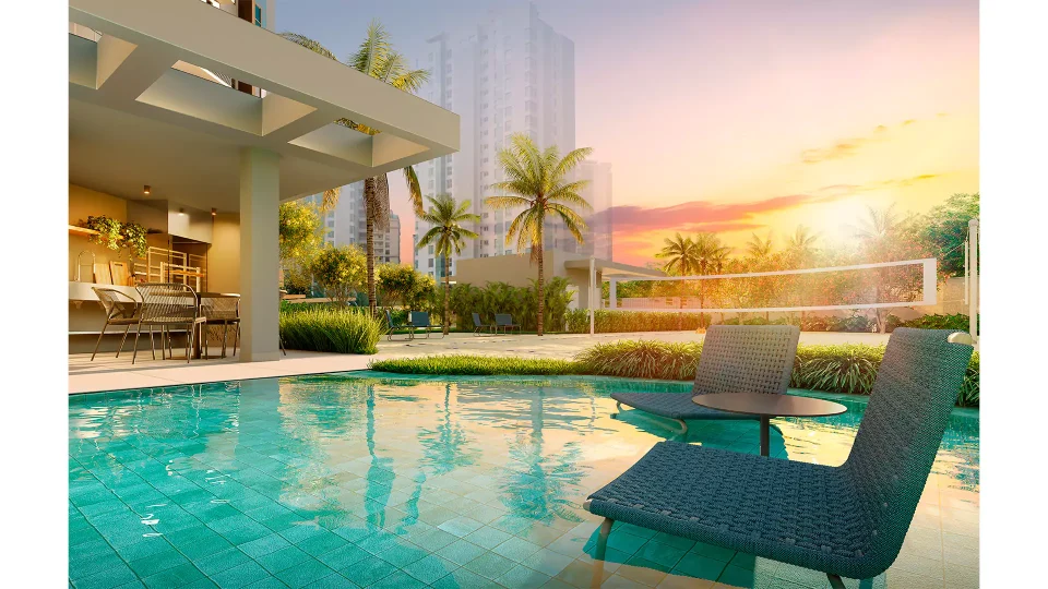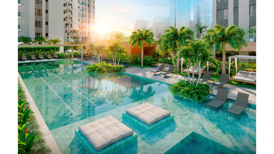 - Piscinas nos apartamentos Garden House, duplex e coberturas lineares.